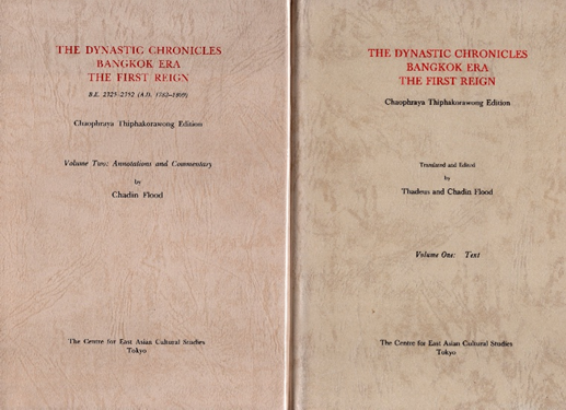 Nghiên cứu tuy là một công việc riêng tư nhưng vẫn cần một chữ “duyên” để có được những gì mình muốn có. Trước đây, khi tìm hiểu về vùng Đông Nam Á, tôi có mua được quyển The Dynastic Chronicles Bangkok Era The First Reign B.E. 2325-2352 (A.D. 1782-1809)[4] do Thadeus Flood và Chadin Flood dịch từ bản gốc do hoàng thân Chaophraya Thiphakorawong soạn – là bộ đầu tiên trong biên niên sử viết về dòng họ Chakkri vẫn còn liên tục trị vì ở Thái Lan đến nay.