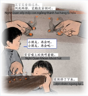 Nghi Quan xếp mấy con ngỗng thành hai hàng tả hữu, mỗi hàng bốn con. Rồi