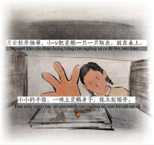 cẩn thận bưng từng con ngỗng sứ ra để lên trên bàn. Gương mặt vàng vọt